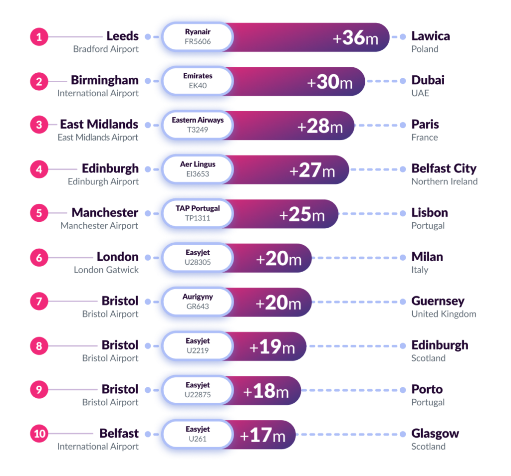 Esendex then took the most commonly scheduled flight code and used FlightRadar24 to analyse every completed flight per flight code, over the past year, taking an average scheduled arrival time and an average actual arrival time. The resulting time difference then revealed whether a flight route was on average delayed, early or on time.