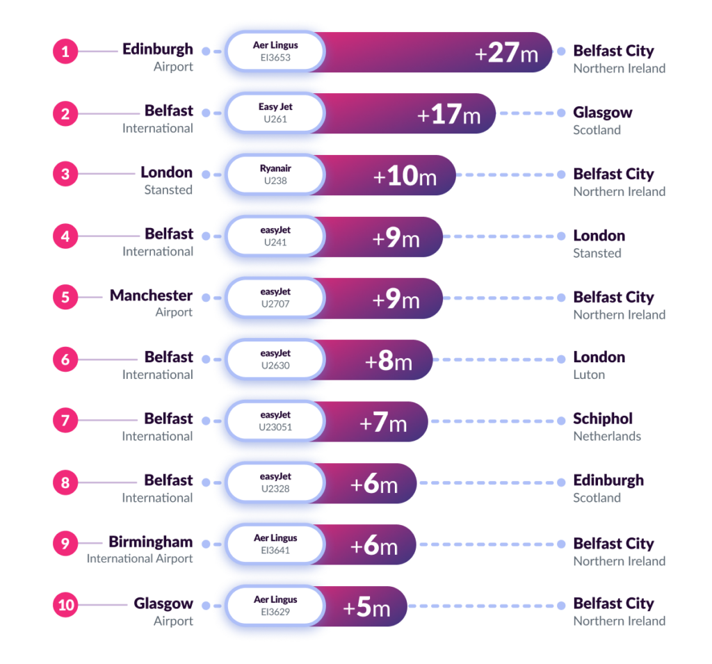 Among the other most delayed routes, the easyJet flight from Belfast International to Glasgow saw an average 17 minute delay.