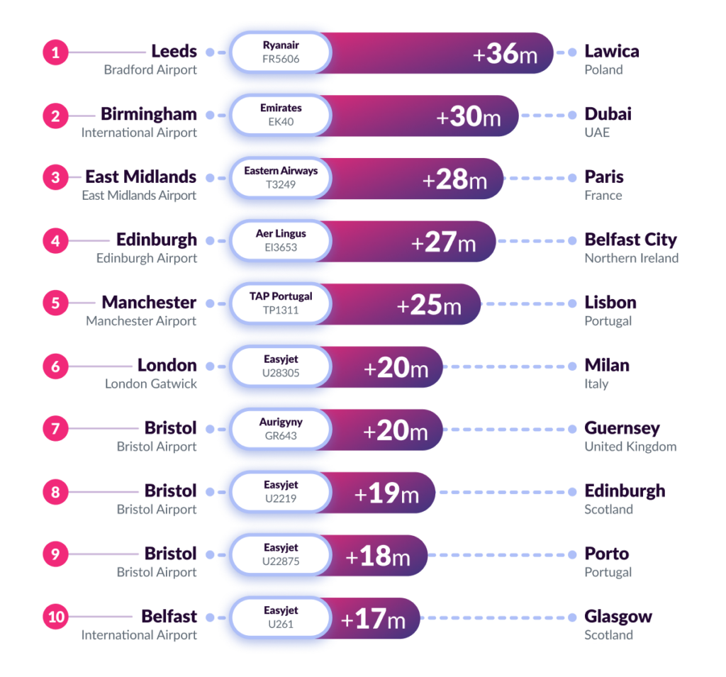 Passengers flying from Leeds Bradford Airport to Lawica in Poland face the longest delays – with flights arriving 36 minutes later than expected.