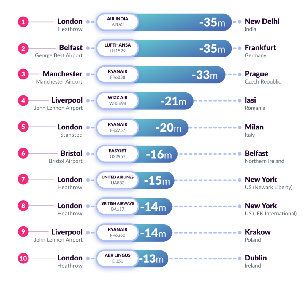 On the other side of the report, London Heathrow to Delhi was named as the earliest arrival route, where passengers were touching down in India on average 35 minutes early. It’s joined at the top of the earliest arrival routes by Belfast City to Frankfurt, with passengers also benefiting from a 35-minute early arrival.