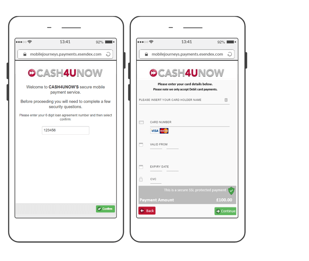Esendex then take that customer data and send out personalised SMS messages to each customer on the list. Contained within the SMS is a link to the fully branded Cash4UNow payment Mobile Journey, which is designed specifically for use on a mobile device.