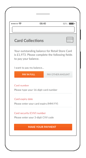 Mobile Payments from Esendex are an innovative new way for businesses to collect funds from customers. Instead of relying on traditional channels like post and manual calls from agents, Mobile Payments use the Mobile Journeys platform to target customers’ mobile devices, and deliver a personalised, fully branded payment environment.